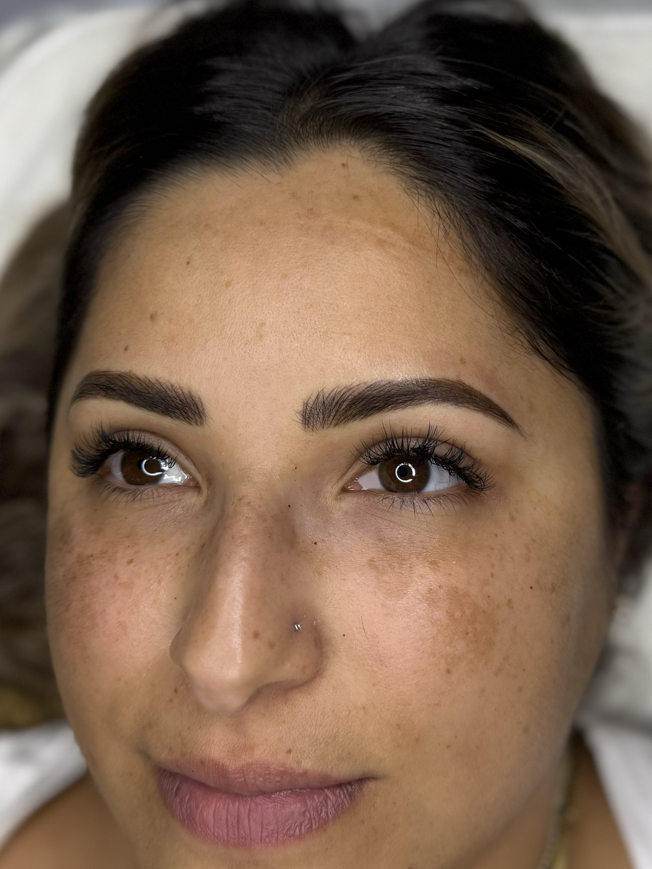 Ombré Powder Brows are also a semi-permanent brow enhancement technique. Using a handheld machine and a sterile needle cartridge, tiny pigment pixels are deposited into the skin, creating a soft-shaded effect. The result is a gradient appearance: darker at the tail and gradually lighter toward the front of the brow. This method covers the full brow shape and is great for those who prefer a more filled in, makeup like look. Most clients can return to their usual routine right after the appointment.